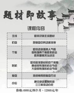课程分三个层次: 1、 稳定盈利的技术:教你如何选题材,选个股,选时机,判别周期,仓控原则 2、 颠覆性的交易观:教你如何看清市场的本质,题材即故事,你只有以看故事的观念参与股市交易,才能认清交易的本质,我们不赚未来,只赚当下情绪的钱。 3、 稳定的交易心态:有稳定的心态,才有稳定的资金曲线。心中充满焦虑,不可能做好交易,这门课程会教你如何通过实战交易,通过不断的事上练,帮你拥有成熟的交易心态
