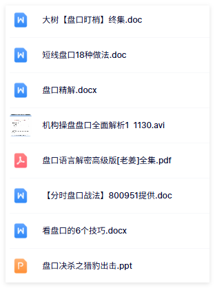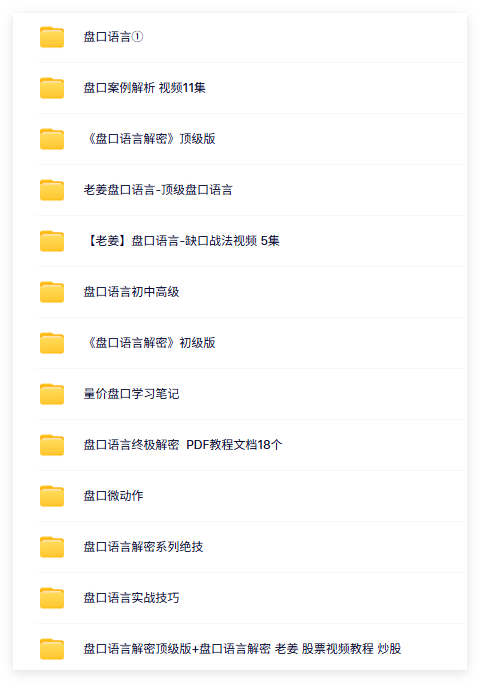 盘口系列-21套资料-7.9GB └─ ├─ 盘口解密大全 │ ├─ 《盘口语言解密》初级版 │ │ ├─ 《盘口语言解密》4-1.rmvb (69.96MB) │ │ ├─ 《盘口语言解密》4-2.rmvb (54.79MB) │ │ ├─ 《盘口语言解密》4-3.rmvb (70.75MB) │ │ ├─ 《盘口语言解密》4-4.rmvb (75.89MB) │ ├─ 《盘口语言解密》顶级版 │ │ ├─ 播放器.exe (142.04KB) │ │ ├─ 老姜《盘口语言解密顶级版》第八讲.flv (78.77MB) │ │ ├─ 老姜《盘口语言解密顶级版》第二讲.flv (33.55MB) │ │ ├─ 老姜《盘口语言解密顶级版》第六讲.flv (39.22MB) │ │ ├─ 老姜《盘口语言解密顶级版》第七讲.flv (42.94MB) │ │ ├─ 老姜《盘口语言解密顶级版》第三讲.flv (36.05MB) │ │ ├─ 老姜《盘口语言解密顶级版》第四讲.flv (31.3MB) │ │ ├─ 老姜《盘口语言解密顶级版》第五讲.flv (53MB) │ │ ├─ 老姜《盘口语言解密顶级版》第一讲.flv (43.49MB) │ ├─ 【老姜】盘口语言-缺口战法视频 5集 │ │ ├─ 10.缺口战法上-1.mp4 (44.75MB) │ │ ├─ 10.缺口战法上-2.mp4 (55.16MB) │ │ ├─ 11-缺口战法复习 .mp4 (63.34MB) │ │ ├─ 11.缺口战法下-1.mp4 (68.3MB) │ │ ├─ 11.缺口战法下-2.mp4 (56.3MB) │ ├─ 老姜盘口语言-顶级盘口语言 │ │ ├─ 《盘口语言解密顶级版》第八讲(流畅).f4v (79.15MB) │ │ ├─ 《盘口语言解密顶级版》第二讲.flv (50.6MB) │ │ ├─ 《盘口语言解密顶级版》第六讲(流畅).f4v (33.04MB) │ │ ├─ 《盘口语言解密顶级版》第七讲(流畅).f4v (42.86MB) │ │ ├─ 《盘口语言解密顶级版》第三讲.flv (52.96MB) │ │ ├─ 《盘口语言解密顶级版》第四讲.flv (47.58MB) │ │ ├─ 《盘口语言解密顶级版》第五讲.flv (73.56MB) │ │ ├─ 《盘口语言解密顶级版》第一讲.flv (67.26MB) │ │ ├─ 第八讲:涨停板的性质与操作绝技 (PPTminimizer).ppt (1.29MB) │ │ ├─ 第二讲:成交密度、速度与涨停.ppt (1.03MB) │ │ ├─ 第六讲:脉冲型涨停.ppt (1.29MB) │ │ ├─ 第七讲:特殊性涨停.ppt (1.25MB) │ │ ├─ 第三讲:阶梯型涨停.ppt (1.07MB) │ │ ├─ 第四讲:斜刺型涨停.ppt (1.18MB) │ │ ├─ 第五讲:震荡型涨停.ppt (1.31MB) │ │ ├─ 第一讲:大单、成交与涨停.ppt (747KB) │ │ ├─ 老姜 大牛市,你为什么赚不到钱?——教你反败为胜的九大绝技().pdf (24.26MB) │ │ ├─ 老姜盘口语言解密高级版全集.ppt (8.36MB) │ ├─ 量价盘口学习笔记 │ │ ├─ 量价-典型股票盘口分析学习笔记1.pdf (56.59KB) │ │ ├─ 量价-典型股票盘口分析学习笔记10.pdf (124.52KB) │ │ ├─ 量价-典型股票盘口分析学习笔记11.pdf (126.75KB) │ │ ├─ 量价-典型股票盘口分析学习笔记12.pdf (93.41KB) │ │ ├─ 量价-典型股票盘口分析学习笔记13.pdf (108.99KB) │ │ ├─ 量价-典型股票盘口分析学习笔记14.pdf (105.94KB) │ │ ├─ 量价-典型股票盘口分析学习笔记15.pdf (94.11KB) │ │ ├─ 量价-典型股票盘口分析学习笔记16.pdf (137.55KB) │ │ ├─ 量价-典型股票盘口分析学习笔记17.pdf (148.71KB) │ │ ├─ 量价-典型股票盘口分析学习笔记18.pdf (96.05KB) │ │ ├─ 量价-典型股票盘口分析学习笔记19.pdf (130.85KB) │ │ ├─ 量价-典型股票盘口分析学习笔记2.pdf (126.46KB) │ │ ├─ 量价-典型股票盘口分析学习笔记20.pdf (112.49KB) │ │ ├─ 量价-典型股票盘口分析学习笔记21.pdf (177.2KB) │ │ ├─ 量价-典型股票盘口分析学习笔记22.pdf (181.82KB) │ │ ├─ 量价-典型股票盘口分析学习笔记23.pdf (258.2KB) │ │ ├─ 量价-典型股票盘口分析学习笔记24.pdf (181.89KB) │ │ ├─ 量价-典型股票盘口分析学习笔记25.pdf (182.34KB) │ │ ├─ 量价-典型股票盘口分析学习笔记26.pdf (179.17KB) │ │ ├─ 量价-典型股票盘口分析学习笔记27.pdf (164.26KB) │ │ ├─ 量价-典型股票盘口分析学习笔记28.pdf (164.95KB) │ │ ├─ 量价-典型股票盘口分析学习笔记29.pdf (176.19KB) │ │ ├─ 量价-典型股票盘口分析学习笔记3.pdf (106.41KB) │ │ ├─ 量价-典型股票盘口分析学习笔记30.pdf (165.17KB) │ │ ├─ 量价-典型股票盘口分析学习笔记31.pdf (141.07KB) │ │ ├─ 量价-典型股票盘口分析学习笔记32.pdf (307.64KB) │ │ ├─ 量价-典型股票盘口分析学习笔记33.pdf (194.83KB) │ │ ├─ 量价-典型股票盘口分析学习笔记34.pdf (142.27KB) │ │ ├─ 量价-典型股票盘口分析学习笔记35.pdf (117.74KB) │ │ ├─ 量价-典型股票盘口分析学习笔记36.pdf (117.12KB) │ │ ├─ 量价-典型股票盘口分析学习笔记37.pdf (140.02KB) │ │ ├─ 量价-典型股票盘口分析学习笔记38.pdf (125.37KB) │ │ ├─ 量价-典型股票盘口分析学习笔记39.pdf (118.56KB) │ │ ├─ 量价-典型股票盘口分析学习笔记4.pdf (123.96KB) │ │ ├─ 量价-典型股票盘口分析学习笔记40.pdf (143.73KB) │ │ ├─ 量价-典型股票盘口分析学习笔记41.pdf (110.92KB) │ │ ├─ 量价-典型股票盘口分析学习笔记5.pdf (121.58KB) │ │ ├─ 量价-典型股票盘口分析学习笔记6.pdf (138.89KB) │ │ ├─ 量价-典型股票盘口分析学习笔记7.pdf (99.82KB) │ │ ├─ 量价-典型股票盘口分析学习笔记8.pdf (106.44KB) │ │ ├─ 量价-典型股票盘口分析学习笔记9.pdf (153.64KB) │ ├─ 盘口案例解析 视频11集 │ │ ├─ 盘口案例解析:盘口看拉高出货.rmvb (25.96MB) │ │ ├─ 盘口案例解析:盘口看老鼠仓.rmvb (21.64MB) │ │ 